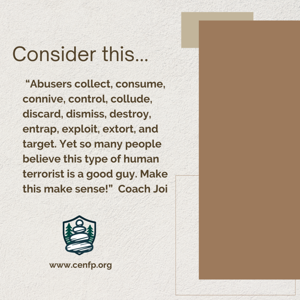 Target: At Center for Peace, we use the term, ‘target,’ to describe the perpetrating behaviors of abuse and coercive control. These actions, and so many others, are the secret works of men, hiding behind their social masks while they destroy their wives, homes, and families with their egregious behavior – and then blame their victims for the outcomes.